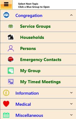 If you change Congregations (see New Congregation) all pre-existing data in this section is removed.